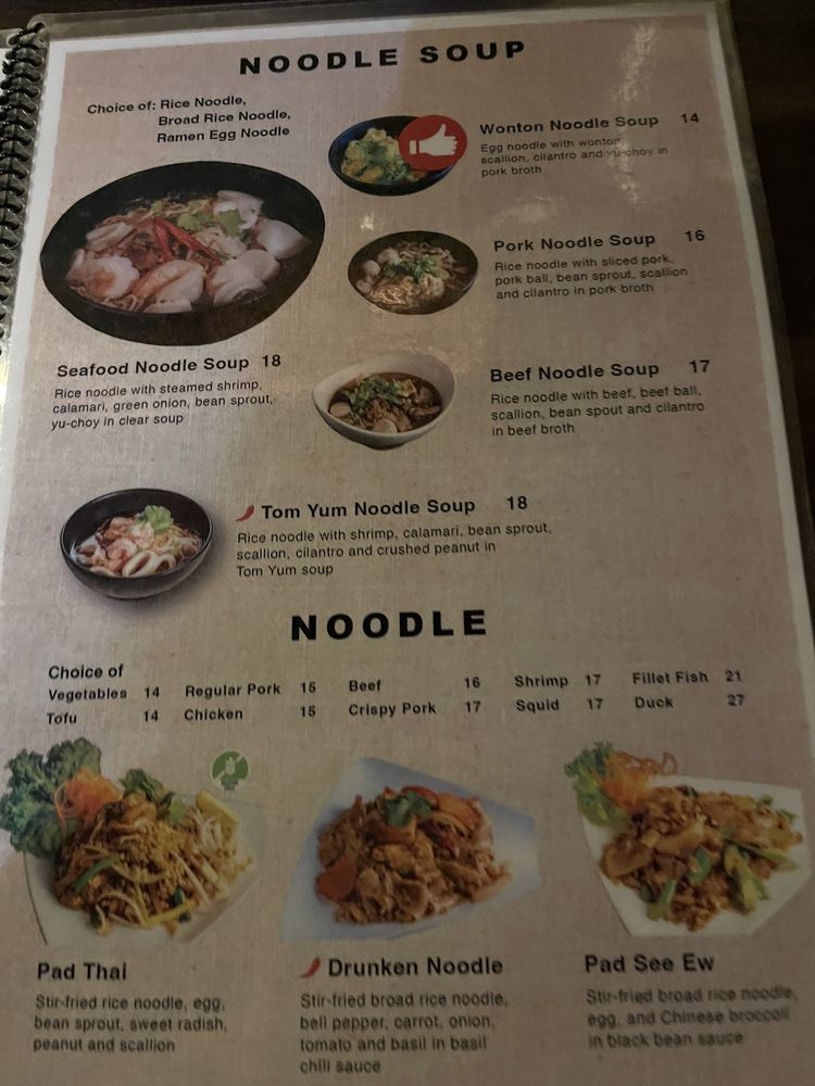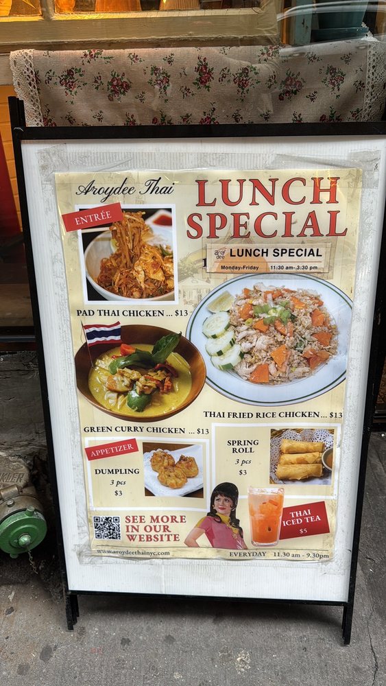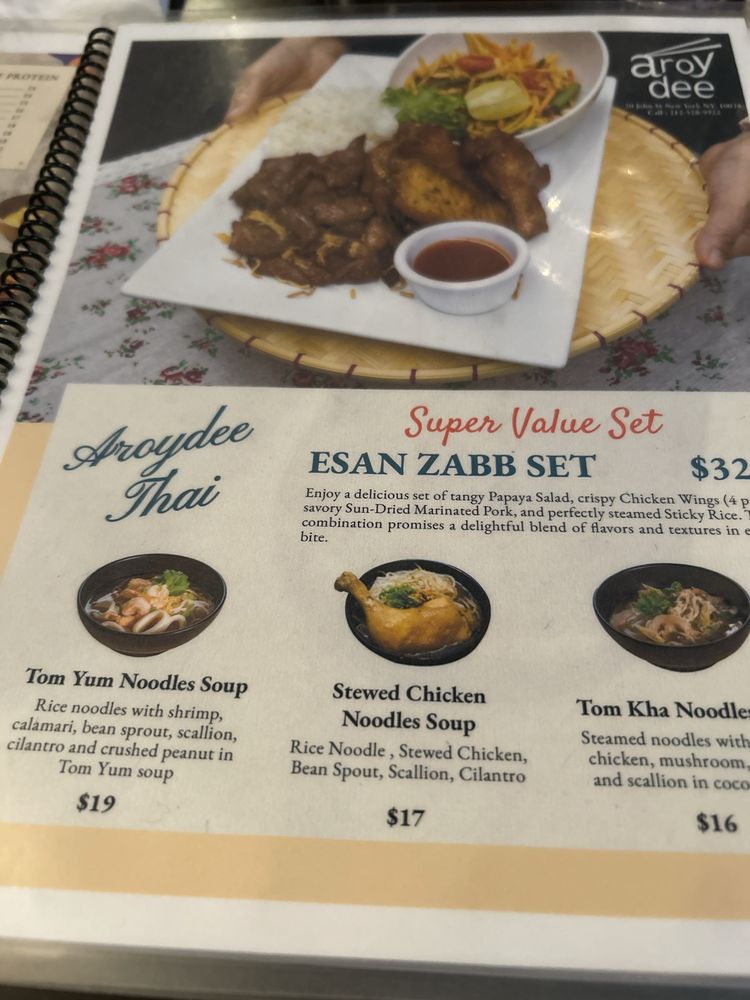Aroy Dee Thai Kitchen, located in New York, offers a wide range of Thai dishes with options for delivery, takeout, reservations, and catering. The menu features popular items like the ESAN ZABB SET combo, Tom Kha Chicken Noodle Soup, and Tom Yum Noodle Soup. Lunch specials include Thai Fried Rice, Heaven Chicken, Pad Thai, and Pad See Ew. Specials like Crispy Pork Kana, Tofu Bean Sprouts, and Black Pepper Pork Rib showcase unique flavors. The restaurant also provides a relaxed atmosphere with options for outdoor seating and happy hour specials. With a variety of vegan and limited vegetarian options, Aroy Dee Thai Kitchen caters to a diverse audience. Don't miss out on the opportunity to indulge in authentic Thai cuisine at this welcoming establishment.